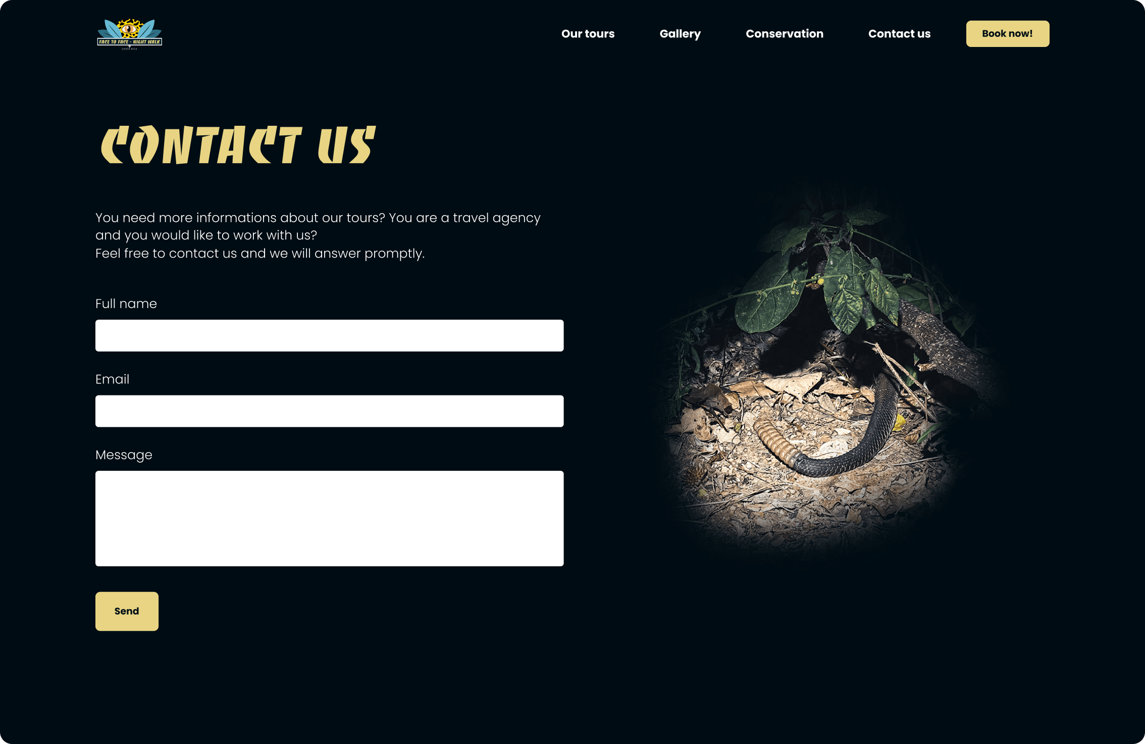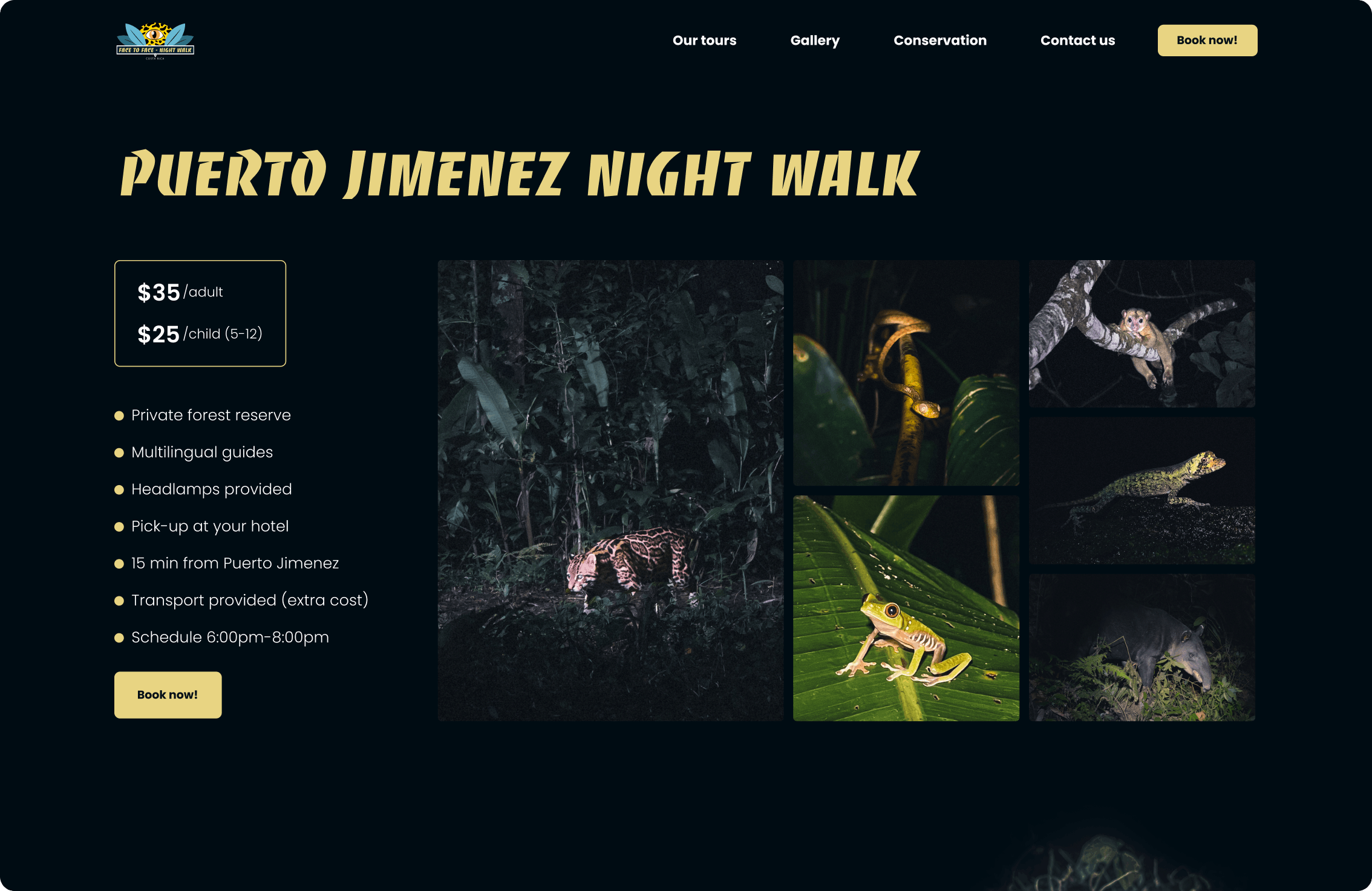 Face to Face Night Walks is a Costa Rica–based company specializing in guided nocturnal wildlife tours in Puerto Jiménez, Tamarindo, and Tortuguero. The goal of the project was to create a strong online presence through a new visual identity and a website that would reflect the unique atmosphere of night exploration while supporting business growth.